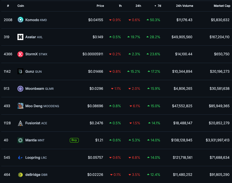 Viikon nousijoiden listalla ei tällä viikolla ole kovin hurjia raketoijia. Selvästi parhaiten kuluneella viikolla on menestynyt Komodo (KMD), jonka vaihtovolyymit ovat tosin mitättömän pieniä eri markkinapaikoilla. Kiinnostavampi nimi on listan toiselta sijalta löytyvä Axelar (AXL), joka julkaisi joulukuun alussa AgentFlux nimisen tekoälytyökalun, jonka julkaisun myötä protokollan volyymit ovat kasvaneet selvästi. Axelar on eri lohkoketjujen ja sovellusten välisiä raha- ja tietoliikennepalveluita tarjoava protokolla ja sen läpi kulkeneiden siirtojen kokonaisvolyymi kohosi juuri yli 1,3 miljardin dollarin rajapyykin.