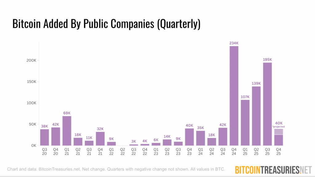Vaikka taseyhtiöiden “buumi” on ollut jo tovin laantumaan päin, niin yritysten tasolla bitcoinostot ovat jatkuneet. Raportin mukaan julkiset ja listaamattomat toimijat ostivat/julkistivat yli 12 644 bitcoinia marraskuun aikana. Näistä 75 % tuli Strategyltä. Marraskuu ei kuitenkaan ollut täysin ostopainotteinen, sillä markkina on saanut merkkejä bitcoin-omistusten myynnistä taseyhtiöiden osalta. Marraskuun aikana nimittäin ainakin viisi taseyhtiötä julkisti bitcoinmyynneistään, joista esimerkkinä voidaan nostaa Sequans, joka möi kolmasosan omistuksistaan. Raportin mukaan bitcoin-operaatioissa näkyy selvästi kaksi esimerkkiä: suuret ja “kurinalaiset” yhtiöt lisäävät omistuksiaan ja pienemmät ovat taipuvaisempia realisoimaan tappioita markkinan myllerryksessä.