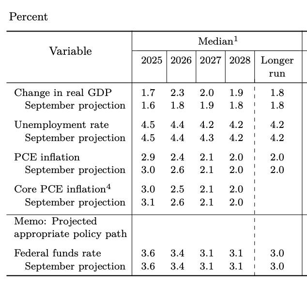 Kuvio 5. Fedin talousennusteet joulukuussa 2025. Lähde: Summary of Economic Projections, December 10, 2025