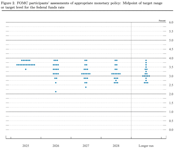 Kuvio 6. FOMC:n dotplot-ennusteet joulukuussa 2025. Lähde: Summary of Economic Projections, December 10, 2025