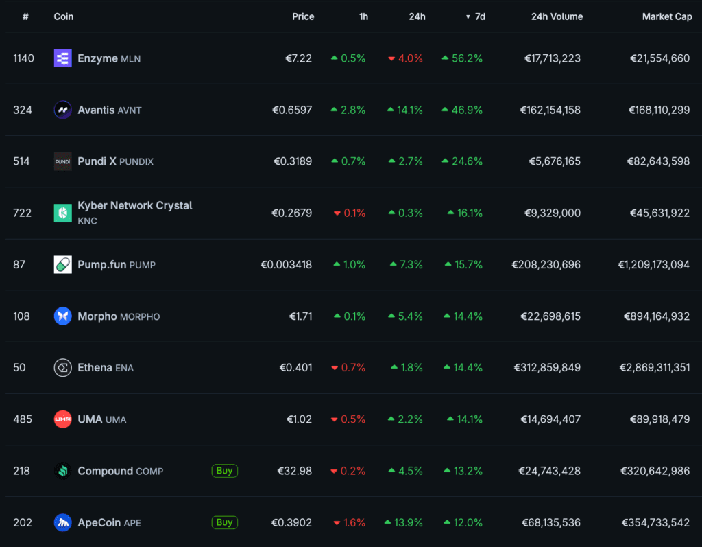 Viikon nousijoiden lista koostuu melko pienistä kryptovaluutoista, joista osa on tehnyt kelpo nousuja. Uutuuksista suoraan kymmenen kärkeen nousivat PUMP (15,7%) ja peräti 46,9 prosenttia viikossa noussut Avantis (AVNT). Avantis nousi päivässä lähes 50 prosenttia sen jälkeen, kun protokollaan lukittuja varoja kuvaava TVL-lukema kohosi yli 100 miljoonan dollarin. Kyseessä on tuore syyskuussa julkaistu token, joka lähti pian julkaisun jälkeen kovaan nousuun, jota seurasi voimakas korjausliike ja nyt se näyttää päässeen uuteen vauhtiin.