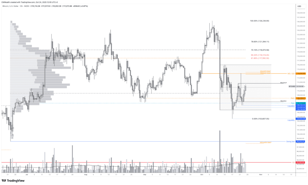 Toistaiseksi bitcoinin hintakehitys on jättänyt toivomisen varaa: kuukauden avauskurssin testausta seurasi myyntipaine, eikä hinta ole onnistunut pysyvästi nousemaan paikallisen kaupankäyntialueen puolivälin yläpuolelle (Kuvio 3). Tarkkaavaisimmat markkinaosapuolet ovat voineet huomata, että hinta ei ole vielä hyväksytty maanantai-rangen ulkopuolelle. Positiivisen markkinanäkemyksen vahvistaminen edellyttää, että hinta hyväksytään paikallisen kaupankäyntialueen yläpuolella – vaarana on hetkellinen poikkeama kyseisen tason yläpuolella, kosketus point of control sekä kriittisiin fibonacci -tasoihin, ja paluu takaisin rangeen, mikä voisi pahimmillaan laukaista suuremman korjausliikkeen 100 000 dollarin alapuolelle. Mikäli hinta ei ole vielä valmis liikkumaan korkeammalle ja likviditeettiä haetaan alemmilta tasoilta, markkinoiden kiinnostus kohdistunee paikallisen kaupankäyntialueen pohjille tai edellisen swing-lown alapuolelle noin 103 000 dollarin tuntumaan, minkä alapuolelle hyväksytty liike muuttaisi markkinanäkymää riskialttiimmaksi.