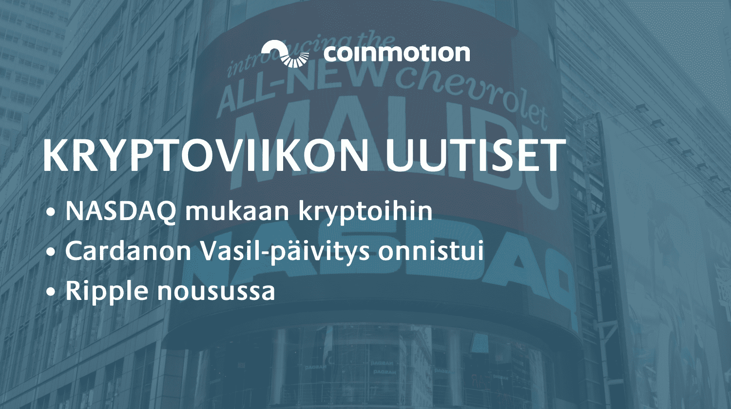 Jälleen yksi viikko kryptomaailmassa takana. Kryptovaluuttojen globaali käyttöönotto otti jälleen merkittäviä askelia eteenpäin yritys- ja instituutiopuolella. Viikolla kryptoyhteisöä ovat puhuttaneet mm. Nasdaqin kryptosuunnitelmat, Stripen kehittämä kryptomaksujärjestelmä ja Cardanon Vasil -hard fork.
