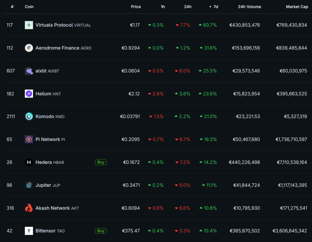 Viikon nousijoiden listaa hallitsee tällä viikolla Virtuals Protocol kahden eri tokenin voimin. Protokollan natiivitoken VIRTUAL on noussut viikossa peräti 60,7 prosenttia ja protokollan toinen hallintotoken AIXBT 25,5 prosenttia. Suurista kryptovaluutoista parhaassa vedossa ovat olleet Hederan HBAR 14,2 prosentin nousulla sekä markkina-arvoltaan suurin tekoälykrypto TAO (10,4 %).