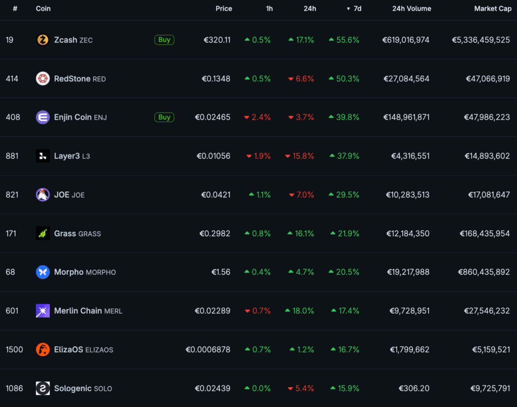 Viikon nousijoiden listaa dominoi viime syksynä suuren yleisön tietoisuuteen palannut Zcash. Tämän yksityisyysominaisuuksiin keskittyvän vanhan lohkoketjun token palasi vuosien kyntämisen jälkeen ryminällä otsikoihin, kun sen token ZEC kymmenkertaisti hintansa syyskuun ja marraskuun välillä. Reipasta nousua seurasi korjausliike muun markkinan mukana, mutta viimeisen kuukauden aikana suunta on ollut jälleen ylöspäin. Listan kakkosena on oraakkelipalvelu RedStonen token RED. Protokolla julkaisi maaliskuun lopussa reaaliaikaista markkinadataa DeFi-protokollille ja instituutioille tarjoavan RedStone Live palvelun, joka on saanut hyvän vastaanoton.