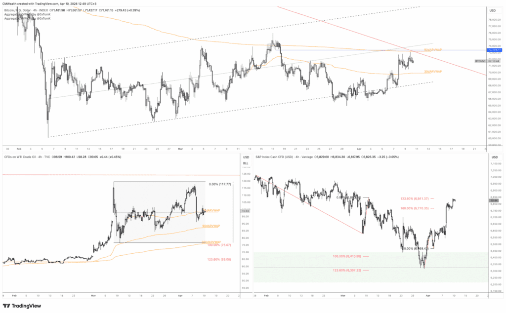 Kuvio 2. Bitcoinin (ylhäällä), WTI-raakaöljyn (vasemmalla) ja S&P 500 -indeksin (oikealla) 4h kehitykset. Lähde: TradingView