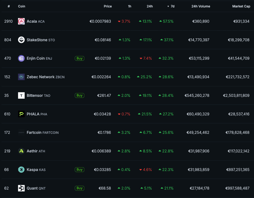 Coinmotionin valikoiman viikon menestyjien lista olisi näyttänyt hulppealta tiistain lukemilla, mutta löytyy sieltä vielä perjantainakin kelpo nousijoita. Markkina-arvoltaan listan suurin on tekoälyprotokolla Bittensorin token TAO, joka on noussut viikossa 28,4 prosenttia ja kahdessa viikossa yli 58 prosenttia. TAO:n kurssia on vauhdittanut kahden vaikutusvaltaisen teknologiahahmon huomio. Nvidian toimitusjohtaja Jensen Huang kommentoi All-In Podcastissa myönteisesti hajautetun tekoälykoulutuksen mahdollisuuksia, ja Social Capital -yhtiön perustaja Chamath Palihapitiya nosti Bittensorin esiin merkittävänä teknisenä saavutuksena. Brittiläisen sijoittajan James Rossin mukaan TAO on ketterämpi mahdollisuus tavallisille sijoittajille ottaa altistusta tekoälyn nousuun kuin suuriin tekoäly-yhtiöihin sijoittaminen ja hän vertaa sen nousua DeFi-kesään 2020. Kesällä 2020 kryptomarkkinoilla ei nähty suurta yleistä nousutrendiä, mutta monet DeFi-tokenit tekivät satojen tai tuhansien prosenttien nousuja.