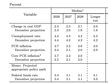 Talousennusteet kertovat saman tarinan kahdelta suunnalta (Kuvio 3). Fed nosti vuoden 2026 BKT-kasvuennustetta 2,3 prosentista 2,4 prosenttiin, ja merkittävämpänä signaalina pitkän aikavälin kasvuennuste nousi 1,8 prosentista 2,0 prosenttiin. Powell selitti tämän johtuvan kasvaneesta tuottavuususkosta – jo ennen kuin tekoäly on alkanut näkyä kunnolla luvuissa. Samaan aikaan inflaatioennuste nousi selvästi: Fedin suosima PCE-mittari ennustetaan 2,7 prosenttiin vuodelle 2026, kun joulukuussa odotettiin 2,4 prosenttia. Ydininflaatio – josta on poistettu ruoka ja energia – nousi niin ikään 2,7 prosenttiin aiemmasta 2,5 prosentista. Yhdessä nämä luvut kertovat, että Fed näkee talouden kasvavan odotettua nopeammin ja inflaation pysyvän odotettua korkeampana – kumpikin tekijä heikentää perusteita koronleikkauksille.